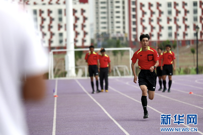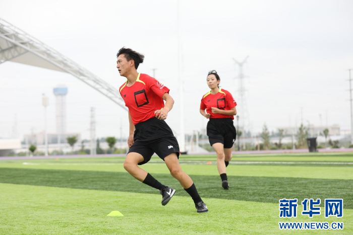 裁判员正在进行40米冲刺跑测试。新华网发(童张伟 摄)