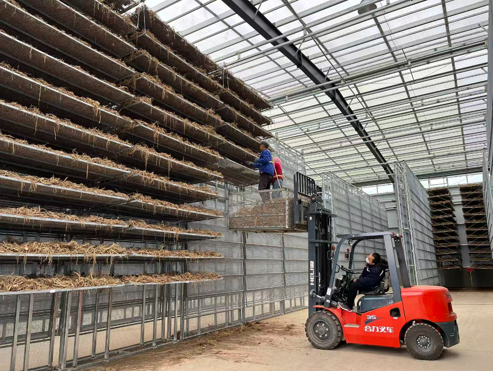庄浪县关山中药材产业园里工人正在晾晒药材。 董春辉 摄