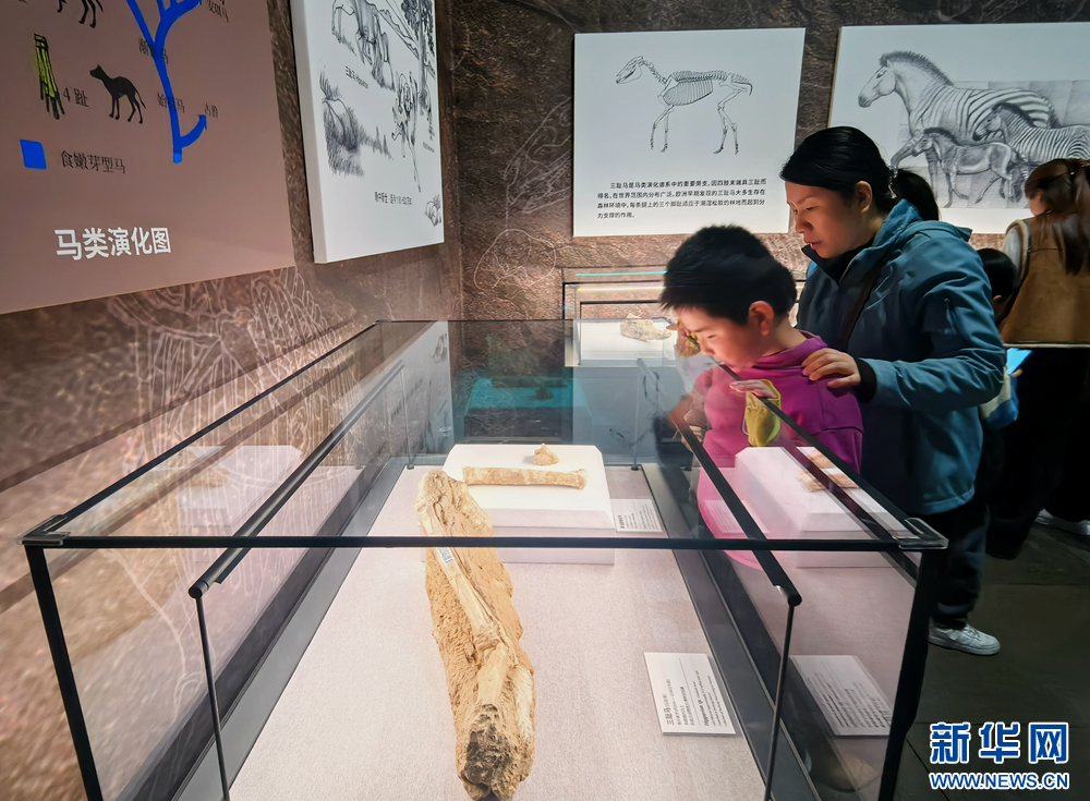 游客参观三趾马化石。新华网(郑琬 摄)
