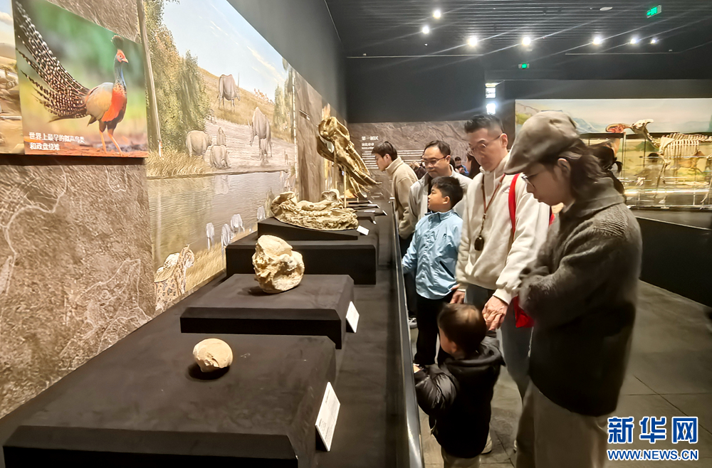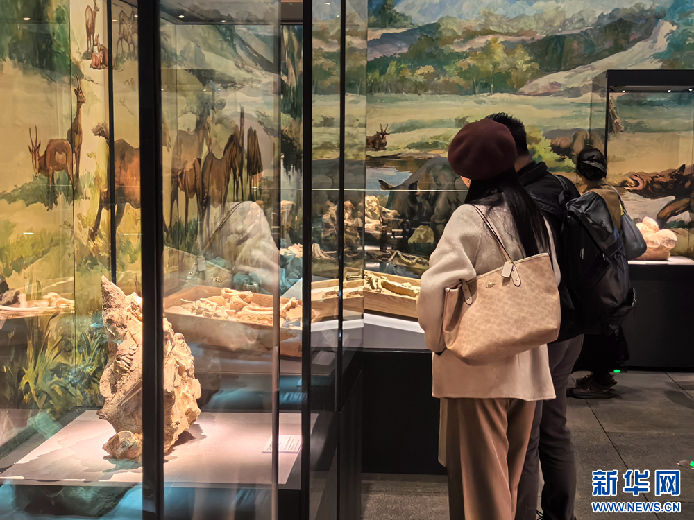 游客参观三趾马化石。新华网(郑琬 摄)